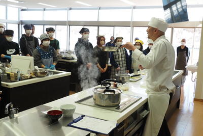 2月20日(金)、校外学習の一環として「魚食の調理実習」を、気仙沼市魚市場のクッキングスタジオにて開催しました。この授業は、「港町・気仙沼の食に関わる産業や文化を知る」という目的で、地元産の食材を使用した調理実習です。