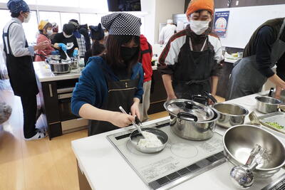 広い調理台やさまざまな調理器具を使い、グループで協力して料理をするという、ふだんの授業ではなかなかできない貴重な機会となりました。
